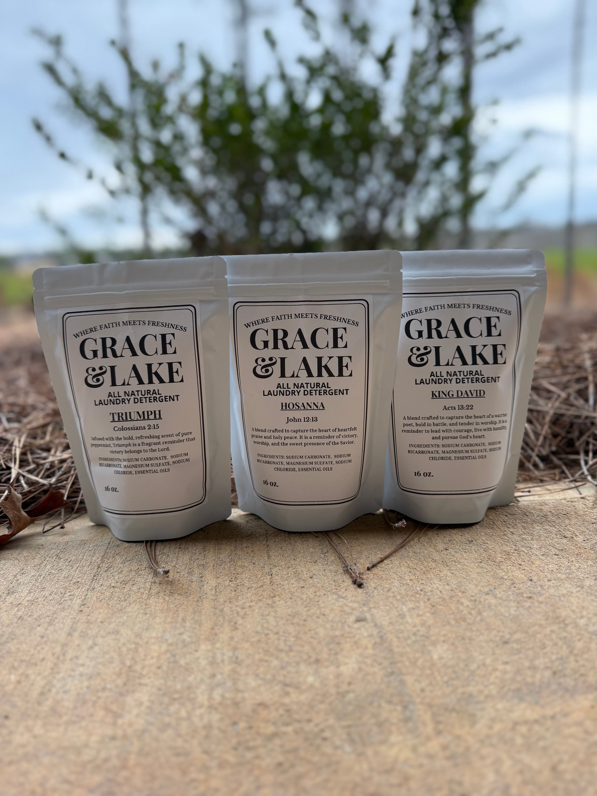 Experience the full heart of Grace and Lake in one beautifully bundled set. The Trinity Trio includes a 8oz bag of each of our signature scents — giving you variety, freshness, and powerful plant-based cleaning in every load.